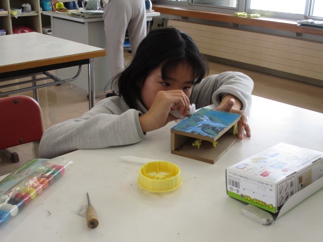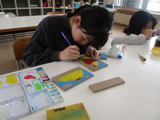 外枠になる板に、自分の好きな絵を描きました。個性のある素敵な作品が出来上がりそうです。