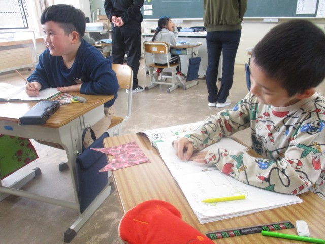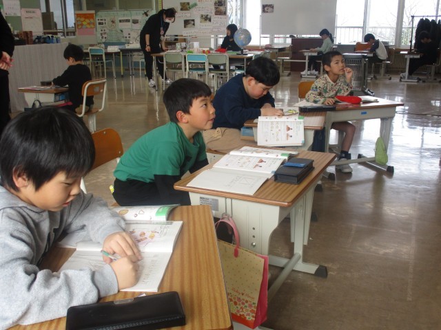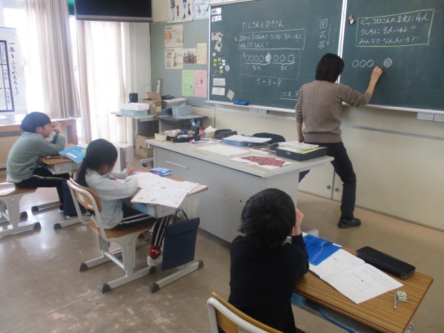 1年生は、たし算とひき算の文章問題に取り組んでいました。