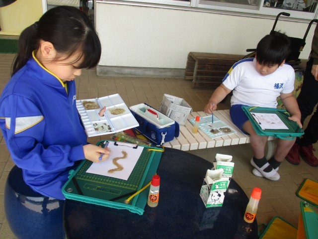 土を使って、絵を描きました。土にもいろいろな種類があり、それぞれ使いたい土を探して、描きたいものを表現しようと頑張っている様子が見られました。