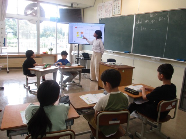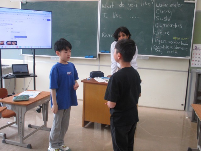 今日は、好きなものの聞き方や答え方を教えてもらい、友達とお互いの好きなものを聞き合いました。