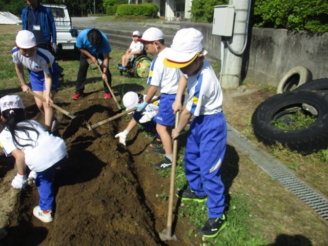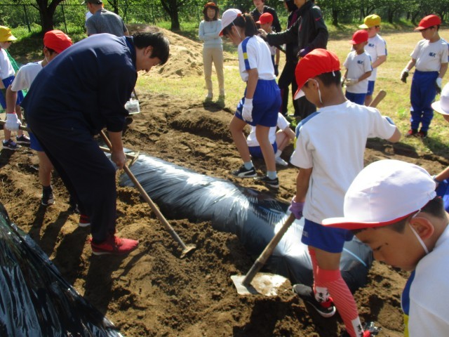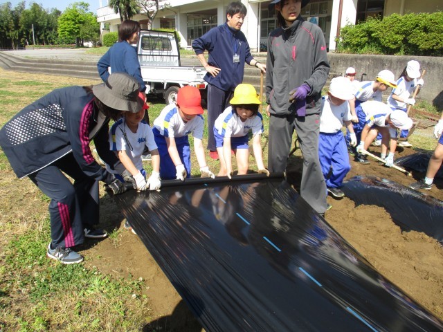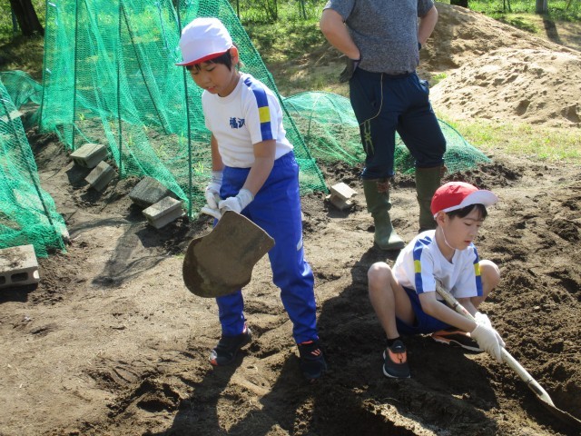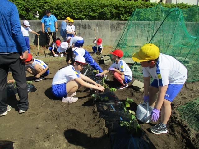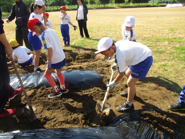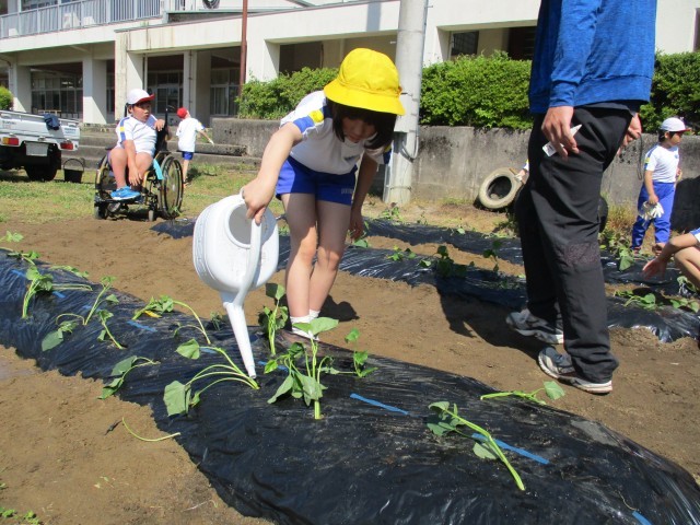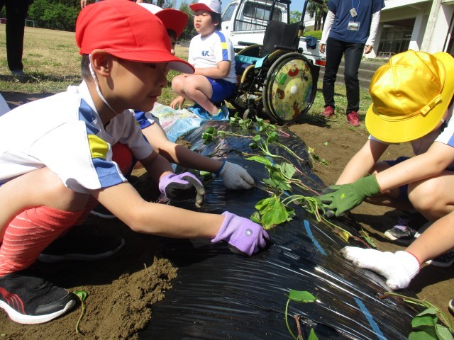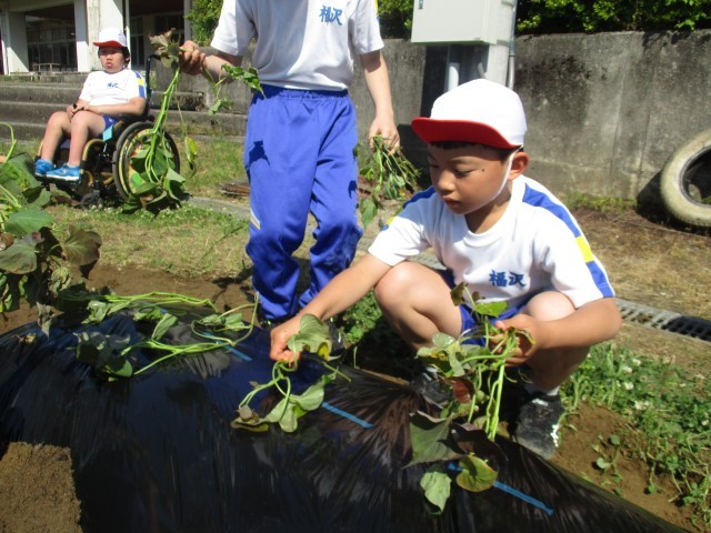 今年度は、班ごとにさつまいもの品種を変え、安納芋、紅はるか、紅あづまの3種類を植えました。