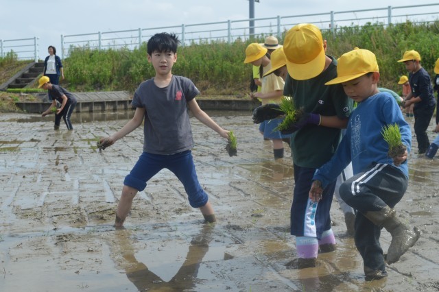 毎年実施しているため、上学年は慣れた手つきで上手に植えることができました。下学年は泥の冷たさや重さに苦戦しながら一生懸命に田植えを体験しました。