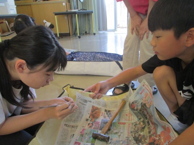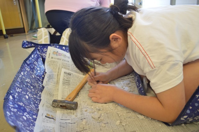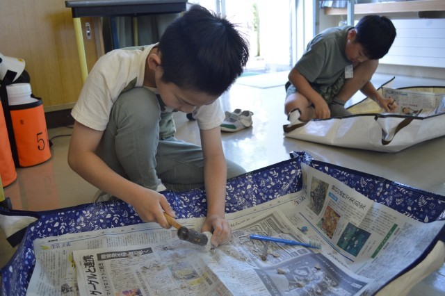 釘と金槌を使って、石を少しずつ削りながら、化石を探しました。