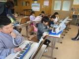 鍵盤ハーモニカで指の動かし方や息継ぎのタイミングを教えて貰いながら、一生懸命に...