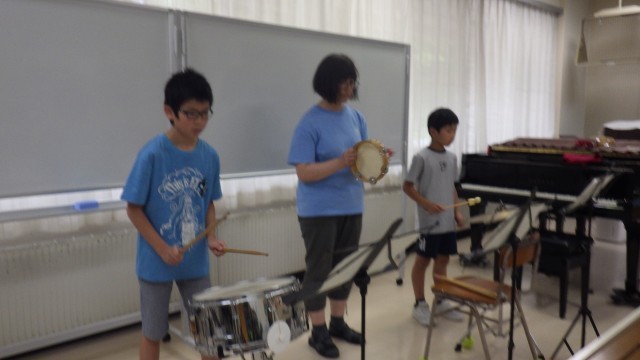 5・6年生は、2つのグループに分かれて打楽器でリズムアンサンブルを行いました。「せまりくる時間」「運動会の開会式」とそれぞれテーマを決め、それに合わせて楽器やリズムを一人一人選びました。12小節のどこをどの楽器が担当したらよいか、強弱をどのようにしたらよいかなどいろいろ考えて発表に臨みました。楽器が出てくる順番をずらしたり、楽器を演奏するばちの種類をかえて音色を変化させたりなど工夫が見られました。