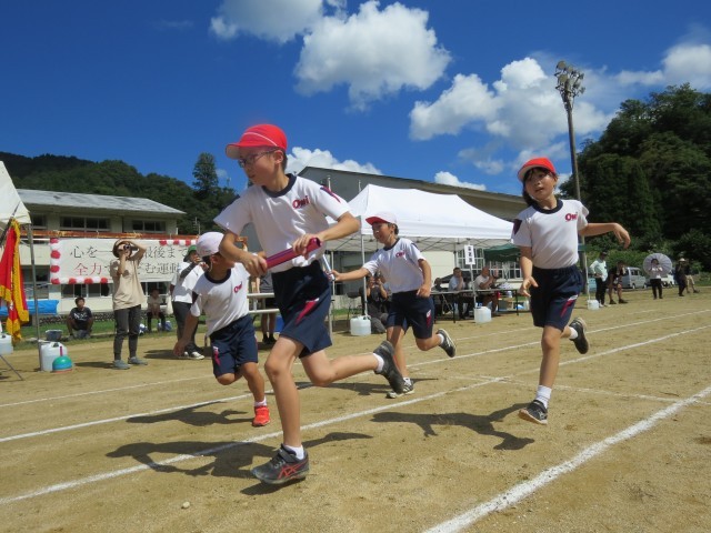 運動会最後の種目は、「やまびこリレー」です。各団5人がバトンをつなぎます。順番を話し合ったり、どこでバトンの受け渡しをするか距離を測ったりして、何度も練習してきました。どちらの団も自分の思いをバトンにのせて、精一杯走りました。