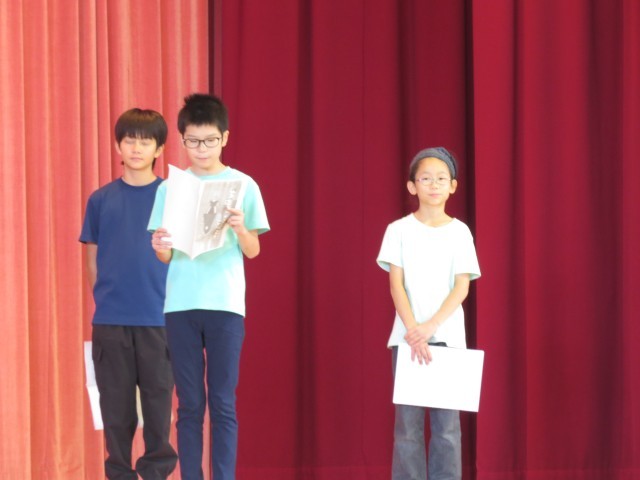 全校発表の様子です。各クラス、自分たちの伝えたいことがどうしたら伝わるかを考えて