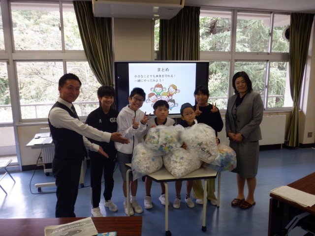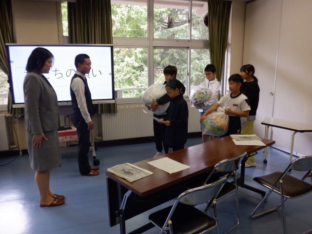 10月21日(火)、小見小学校の5・6年生が取り組んできたペットボトルキャップ回収活動のまとめとして、富山市の奥村商事の皆様をお迎えし、ペットボトルキャップの回収とリサイクルの大切さについて、お話をしていただきました。