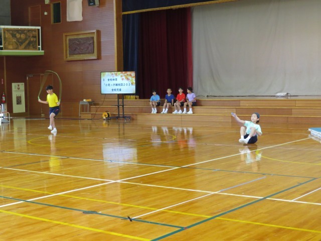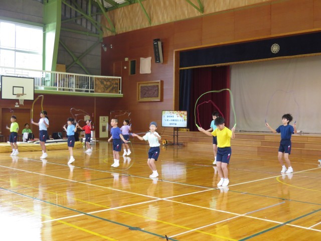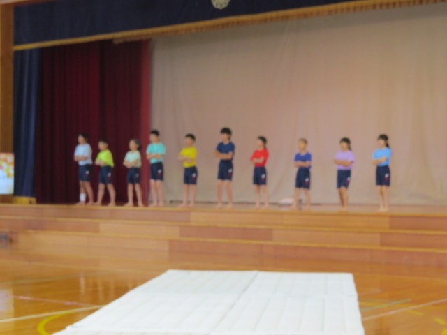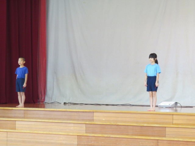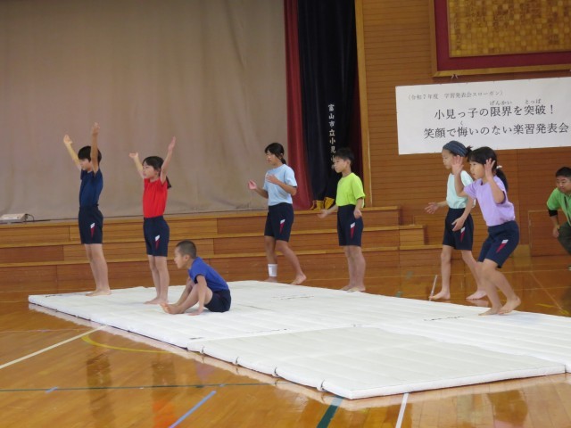 今日は、学習発表会を行いました。2、3年生の元気な「はじめの言葉」を皮切りに、「全校体育」「全校発表」「全校音楽」と、堂々とした演技が続きました。全校体育「小見っ子雑技団」では、運動会後から練習を続けてきたマット運動、縄跳びに取り組みました。音楽や仲間の動きに合わせながら、自分の選んだ技をしっかりと決め、自信をもってポーズまでつなげることができました。