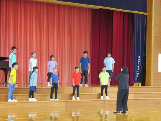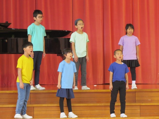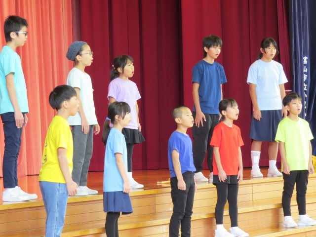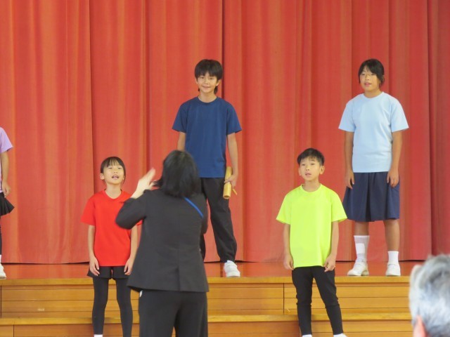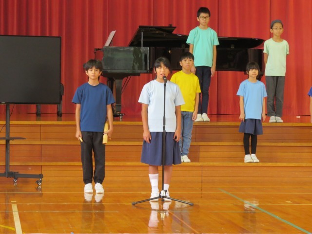 全校合唱では、はじめに児童を代表して6年生が演奏する曲を紹介しました。歌詞の意味を考え、伝えたい自分の思いも発表しました。次に「笑顔の花が咲くように」を斉唱しました。間奏の所ではリズム打ちを行い、最後の拍は、区域連合音楽会からパワーアップさせて、一人一人が思い思いの決めポーズでお客さんにアピールしました。最後は、「PRIDE」を合唱しました。「自分が感動、聴いてくださる方を感動」を全体のめあてにして、自分の思いを歌にのせ、体育館に響かせました。
