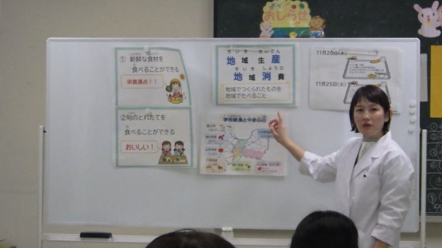 学校保健課の栄養士さんに、この学校給食とやまの日のメニューはどのように決まるかや、今日の給食の材料はどこからやってきたのかについて、教えていただきました。