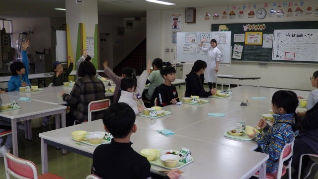 子供たちは、約3万食の給食を作るための材料が富山市をはじめ、富山県内から集められていることを知り、驚いていました。さらに材料を生産してくださる方への感謝の気持ちを高め、おいしく頂いていました。