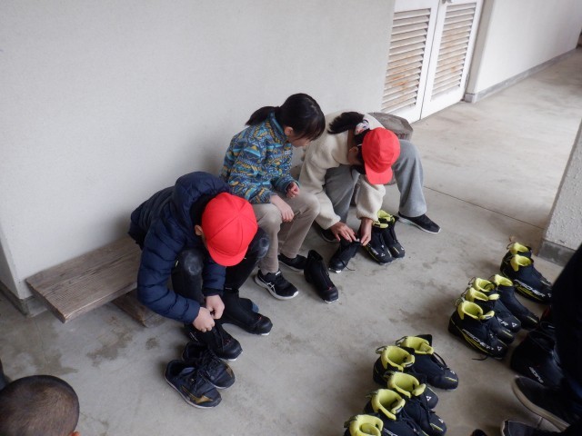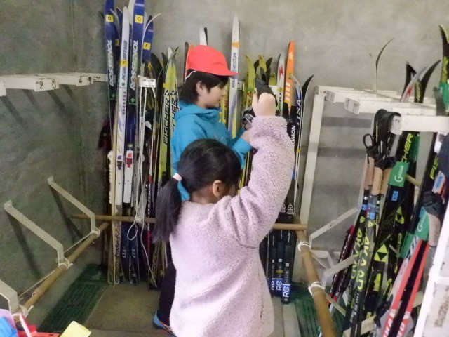 先生に相談しながら、お互いに声をかけ合って、スキー板やストック、靴のサイズや置く場所を確かめました。