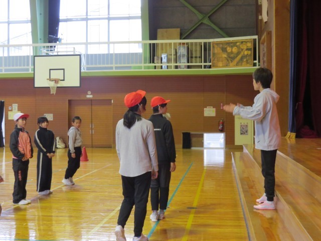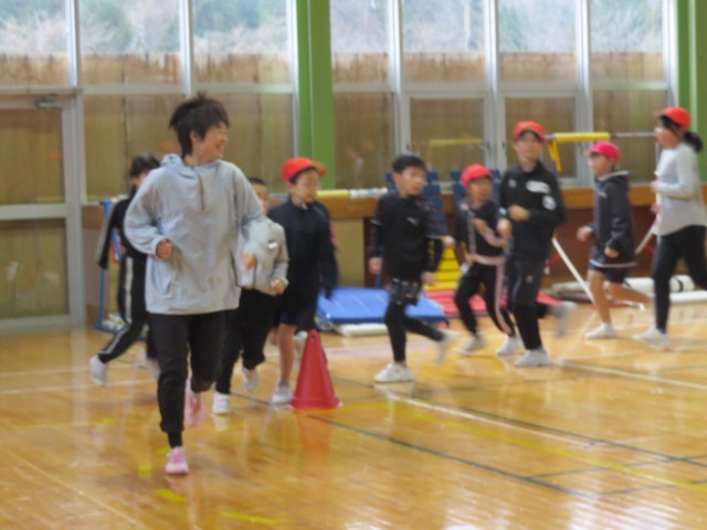 後半は、小見小学校で取り組んでいるクロスカントリースキーに役立つトレーニングを実際に紹介していただきました。体の軸づくりを大切にしたトレーニングや走り方を教えていただき、子供たちは磯野さんと一緒に体を動かしながら、楽しそうに取り組んでいました。