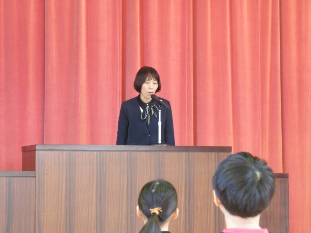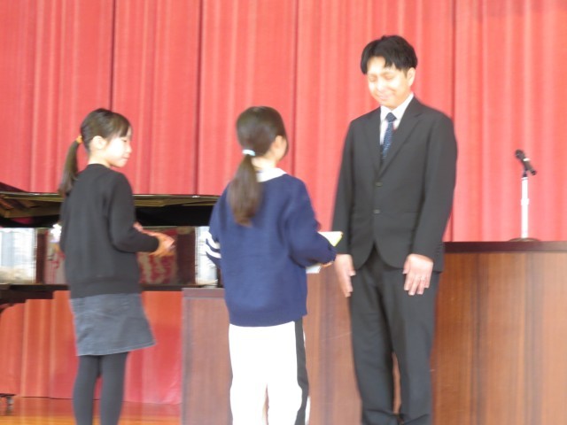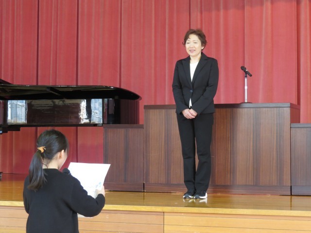 お世話になった3名の教職員の方々との離任式がありました。代表児童がお手紙を読み、花束と色紙を渡しました。歌のプレゼントに今までの感謝の気持ちを込めることができました。