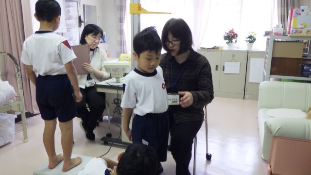 2限に発育測定、視力、聴力検査をしました。入学したばかりの1年生や転入生に検査の受け方を