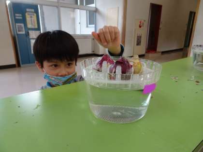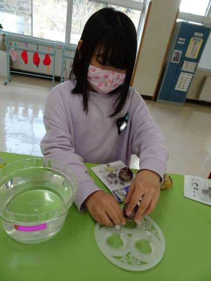 冬の校内を明るくしようと、ヒヤシンスの水栽培を始めます。