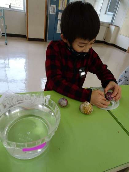 球根を選んだ後、水栽培の容器に球根をセットし、水の量を調節しました。早くも、小さな芽が出ている球根があります。