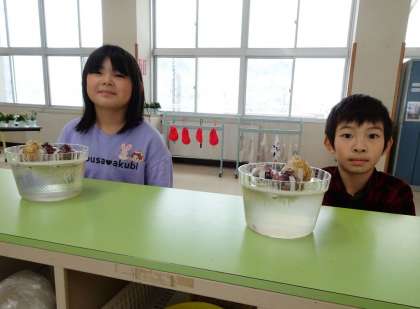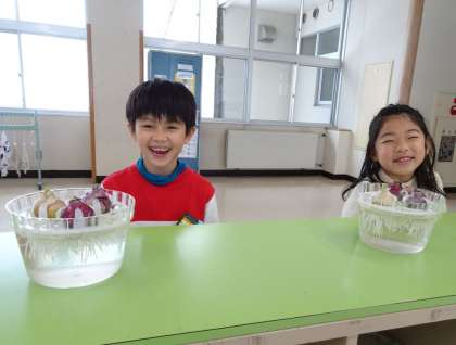 ヒヤシンスの水栽培。球根から白い根がぐんぐん伸びています。芽も少しずつ出てきています。