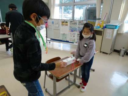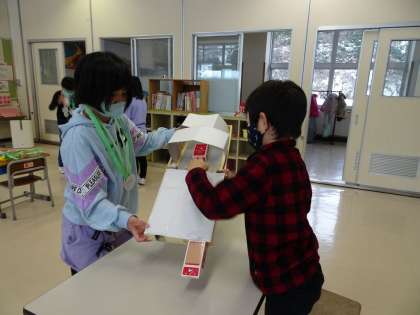時間いっぱい、何度も挑戦してくれる3・4年生のみんな。自分の作ったおもちゃで遊んでもらった1・2年生も、うれしそうです。