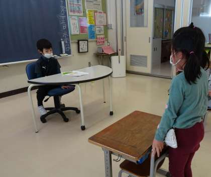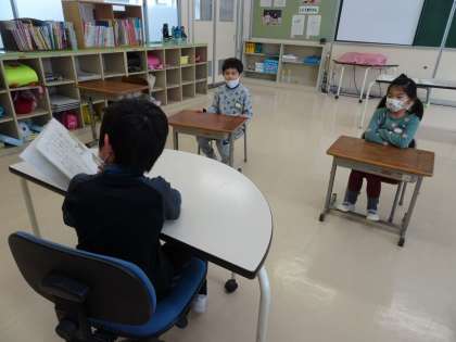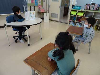 今日は、できあがったお話を1年生に読んでくれました。お話を聞いた1年生は、おもしろかったところなど、感想を伝えました。