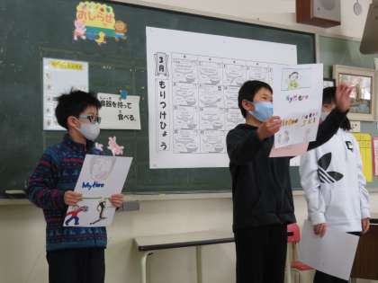 英語スピーチ(5年生) 公開日 2021/03/08 更新日 2021/03/08 5・6年生 外国語の授業で考えた「My Hero」のスピーチをしました。 6年生のすごいと思うところを英語でスピーチして、作ったカードを6年生にプレゼントしました。