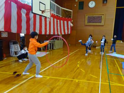 フラフープに通す挑戦では、6年生の協力もあり、こちらも盛り上がっていました。