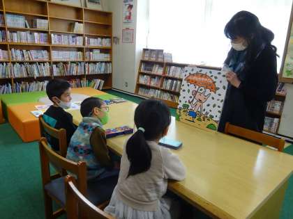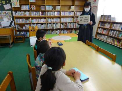 図書館司書の先生から図書館の使い方を聞きました。また、大きな本を読んで聞かせてくださいました。