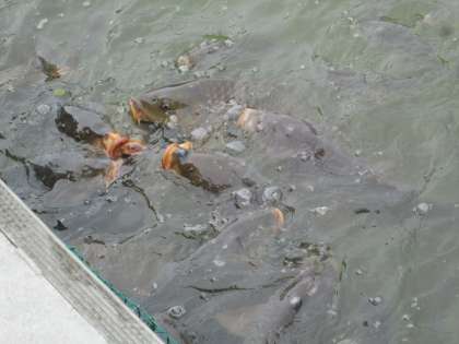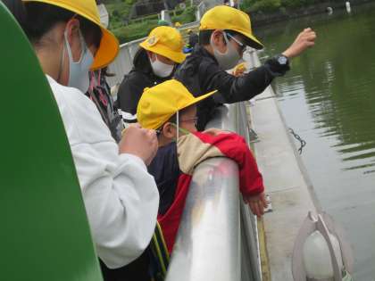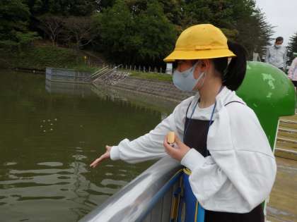 グループ活動の最初は、鯉のえさやりから・・。「もりもり食べるなあ」