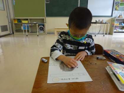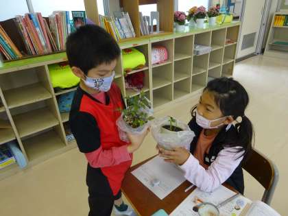 1年生はアサガオの種を、2年生は野菜の苗を、植える前によく見て日記をかきました。