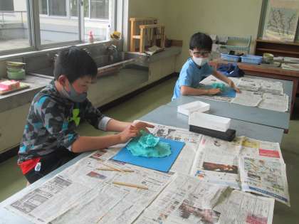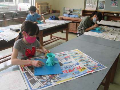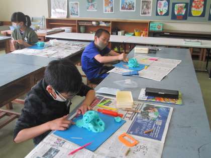 5・6年生は、図工の時間、「わたしのいい形」という題材で、かきべらなどの用具を使って彫ったり、削ったりしながら、思い浮かんだ形を粘土で表しました。
