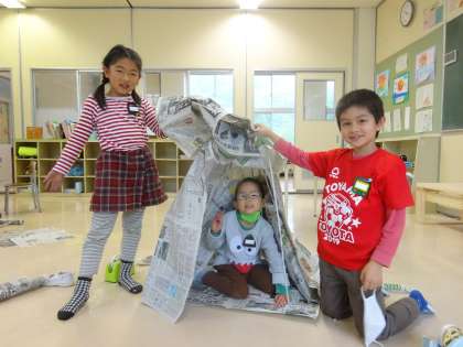 最後は、3人で新聞紙テントをつくりました。