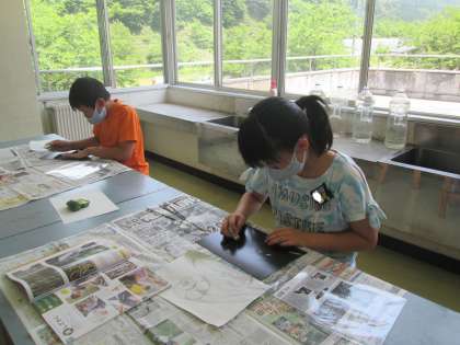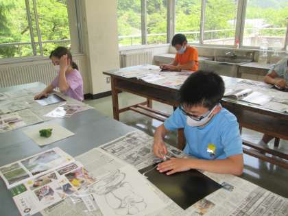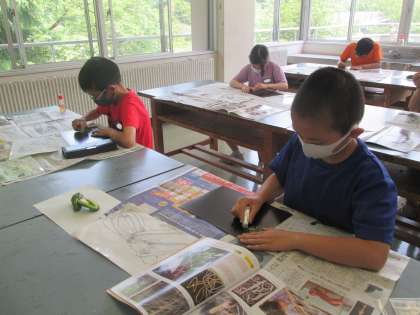 先週スケッチしたピーマンの下絵を見ながら、今日は黒い紙を消しゴムで消して立体的に表現をしていきました。消す力の加減を調節しながら作品を描いていきました。