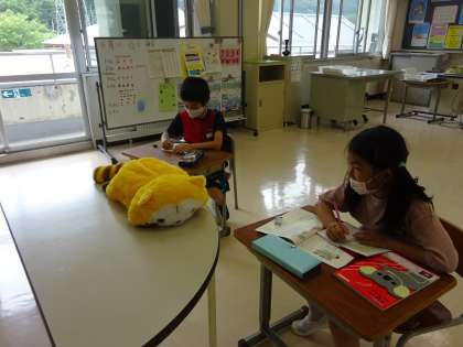 よく見て、正しくメモをとろう 公開日 2021/06/18 更新日 2021/06/18 1・2年生 2年生は、家の周りや出かけた先で見つけたものについて、文章を書く学習をします。 文章を書くためのメモをとる練習を、ぬいぐるみで行いました。 休みの日、見つけたものを上手にメモしてきましょう。