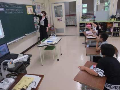 元気な声が3・4年教室から響いてきました。自分の好きな色を英語で話す学習を、楽しく行っています。