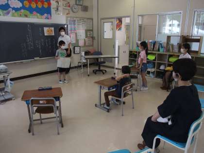 低学年は国語の学習です。自分の考えた「あったらいいな、こんなもの」を紹介したり、質問したりしています。見ている保護者からの質問にもしっかりと答えることができました。