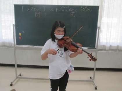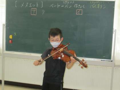 今日は、音楽の時間、ベートーヴェンの「メヌエット」鑑賞しました。ヴァイオリンで演奏される曲なので、実際にヴァイオリンに触れてみました。