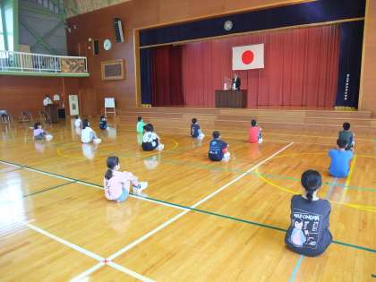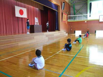 体育館で大きく広がって始業式を行いました。校長先生の話を聞いた後、4年生が夏休みにがんばったことや2学期のめあてを元気よく発表しました。