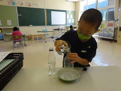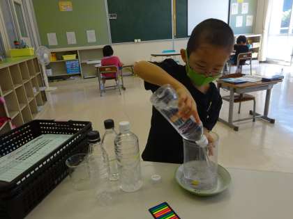 算数の時間、1年生はいろいろな方法で水のかさをくらべました。