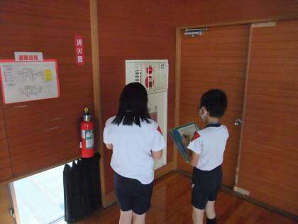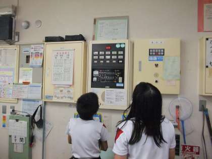 3年生は社会科で消防の仕事について学習しています。今日は学校の消防設備を調べました。職員室の火災警報装置を見たり、校内の消火栓、防火シャッター、火災報知器、消火器の数を数えたりしました。予想していたよりも多いことにびっくりしました。