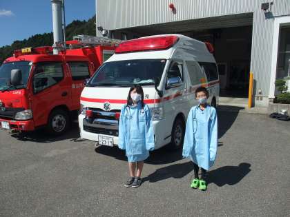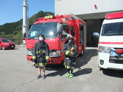 職員の方の勤務や救急車、消防自動車に載せている様々な機材についても説明していただきました。最後に防火服を着て記念撮影です。
