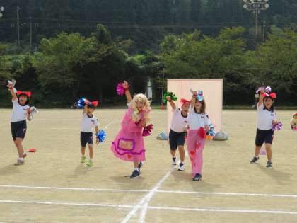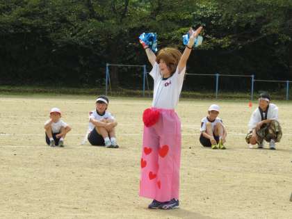 応援合戦 まずは赤団です。応援団長の気合いが伝わってきます。楽しいキャラクターが登場しました。