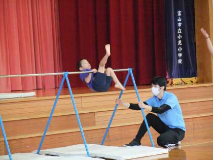 鉄棒にチャレンジです。1年生の連続逆上がりに大きな拍手が起こります。