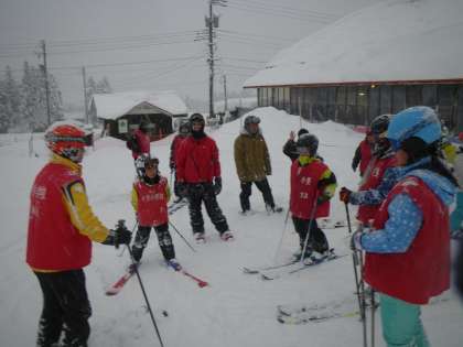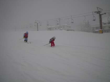 時折吹雪く悪天候でしたが、新雪滑降を楽しむ小見っ子です。