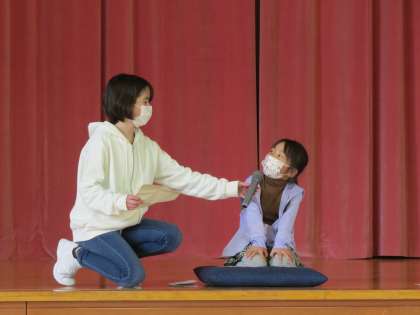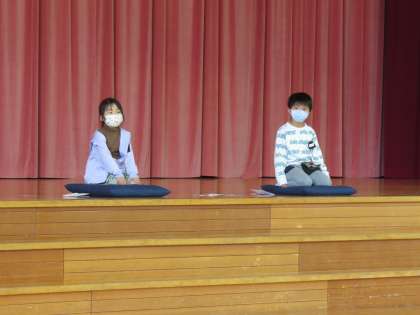 今日のフリータイムに入学おめでとう集会を行いました。集会では、1年生へのインタビューや楽しいゲームがありました。最後にプレゼントももらって、1年生はとてもうれしそうでした。