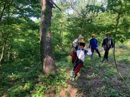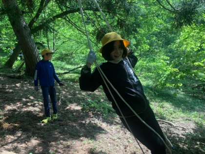 ロープを木に引っ掛けてターザンロープで遊んでいます。