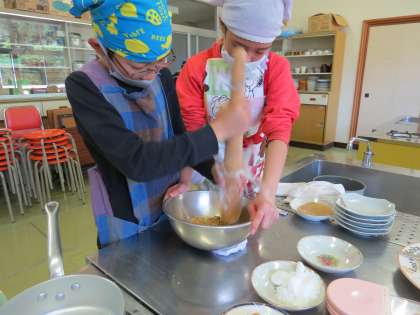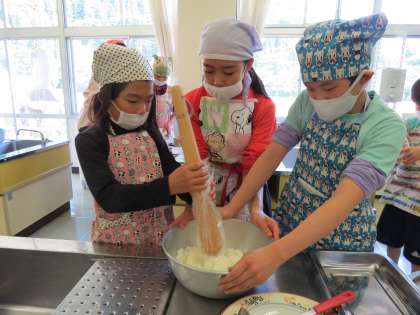 いろいろクラブの第1回目は、五平もち作りでした。炊いたお米をつぶし、味噌だれも一から作りました。
