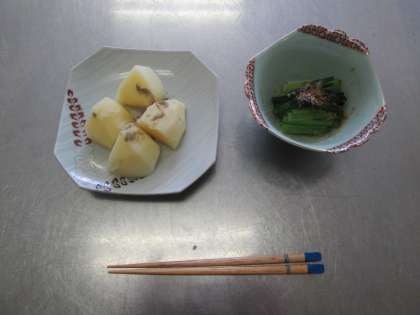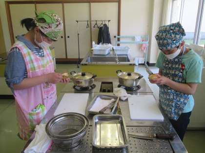 5年生は、家庭科の調理実習でじゃがいもと青菜(小松菜)をゆでました。じゃがいもを包丁を使ってむくのはでこぼこしていて大変でしたが、安全に気を付けながら上手にむくことができました。青菜はゆでる前とゆでた後のかさや色を確認しました。じゃがいもも青菜もゆで加減は最高でした。