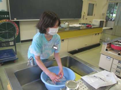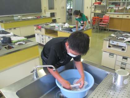 6年生は、家庭科で洗濯の学習をしました。昨日着ていたTシャツと靴下を手洗いしました。