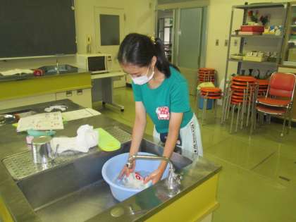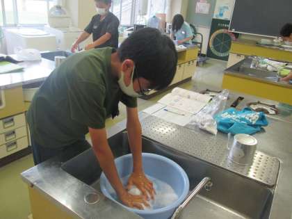 洗濯物の重さ、水の量や洗剤の量もしっかりはかってから、手洗いしました。洗い、すすぎ、脱水をした後、ハンガーに干しました。